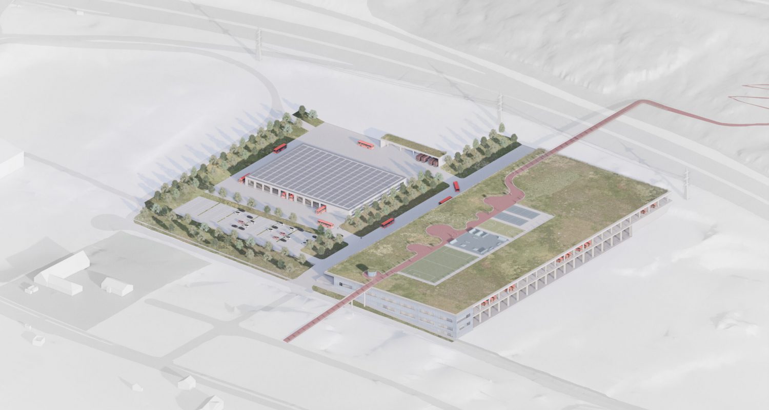 • Kontorer, garderober, pauserom/kantine for administrasjon og bussførere totalt ca. 2000 m2. Disse funksjonene kan plasseres i eget bygg.